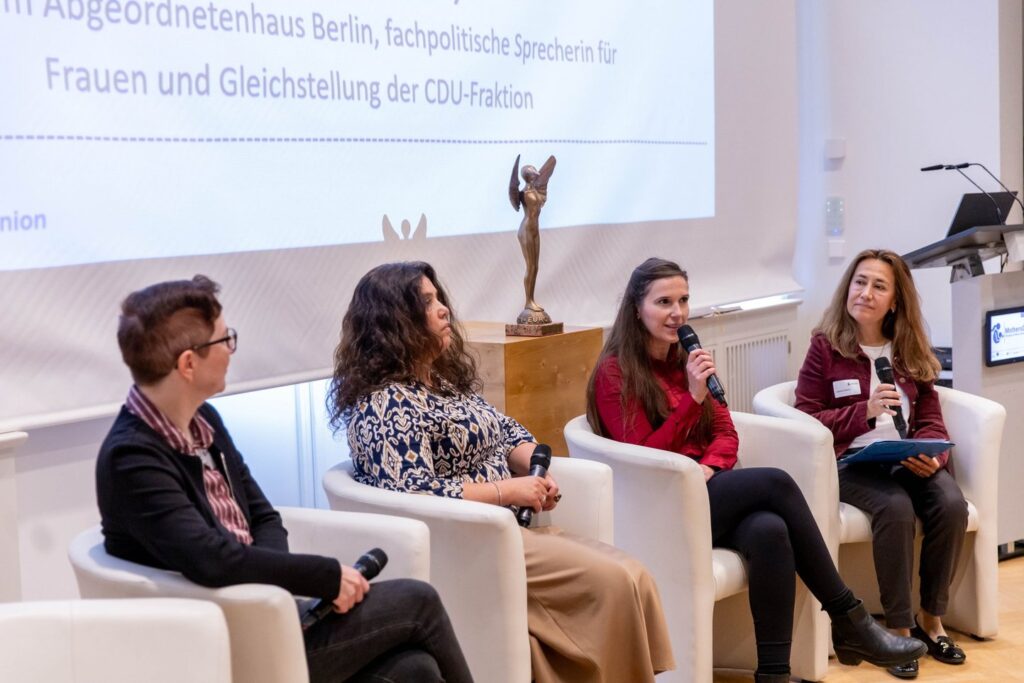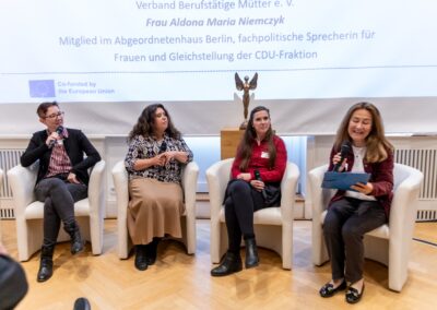 Im Anschluss fand eine Podiumsdiskussion statt, bei der verschiedene Expert:innen und Projektpartner:innen über die Zukunft der beruflichen Bildung für Mütter diskutierten. Martha Kauffmann (Unternehmerin, Mali Berlin gGmbH), Dr.-Ing. Diana Tartakowska (Interim Expertin & Auditorin), Daniela Baum (Plan B gemeinnützigen Gesellschaft für berufliche Bildung mbH) und Johanna Schima (Make Mothers Matter) tauschten sich gemeinsam mit dem Publikum über die Notwendigkeit von gezielten Programmen für berufstätige Mütter aus und betonten die Bedeutung von politischen und innerbetrieblichen Maßnahmen zur Förderung der Vereinbarkeit von Familie und Beruf.