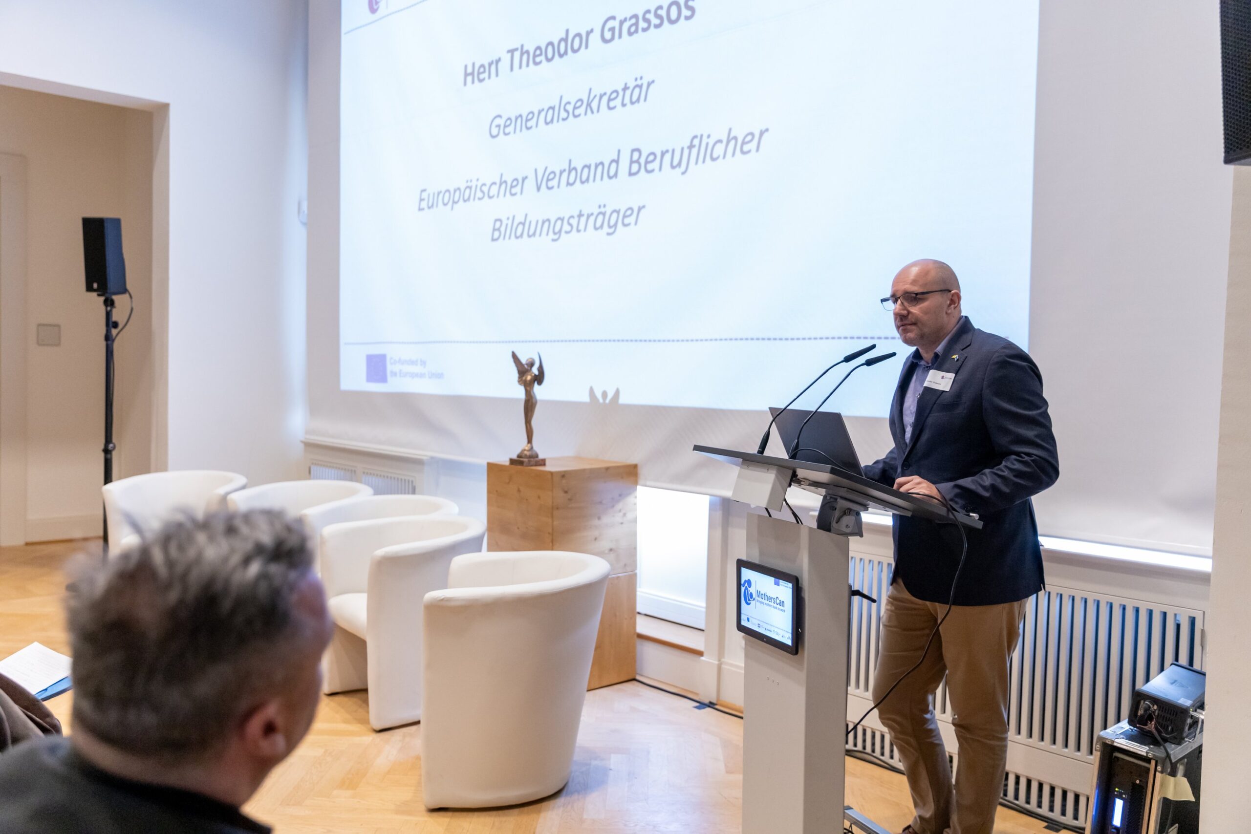 Im Anschluss hielt Prof. Dr. Bernhard Beckmann vom Europäischen Bildungswerk für Beruf und Gesellschaft (EBG) einen Impulsbeitrag, gefolgt von Theodor Grassos, dem Generalsekretär des Europäischen Verbandes beruflicher Bildungsträger (EVBB), der die internationale Dimension des Projekts und dessen Beitrag zu einer inklusiveren Bildungspolitik hervorhob.